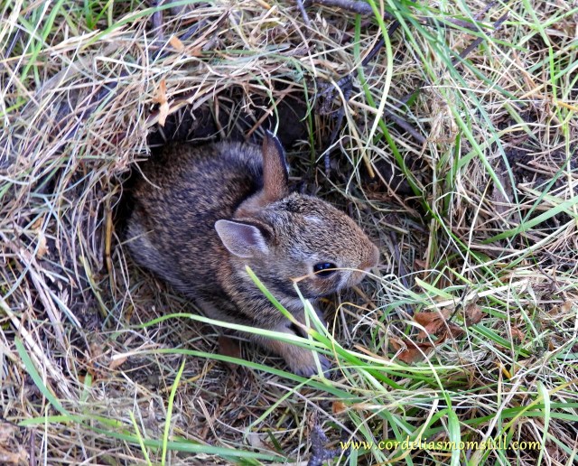 • Oh, those bunnies are still around, just not in the nest any more. We have a wooded area between our house and the next, and they’re usually either in there or under the bushes around the house. At any rate, so long as they can outrun Cody, all is good.