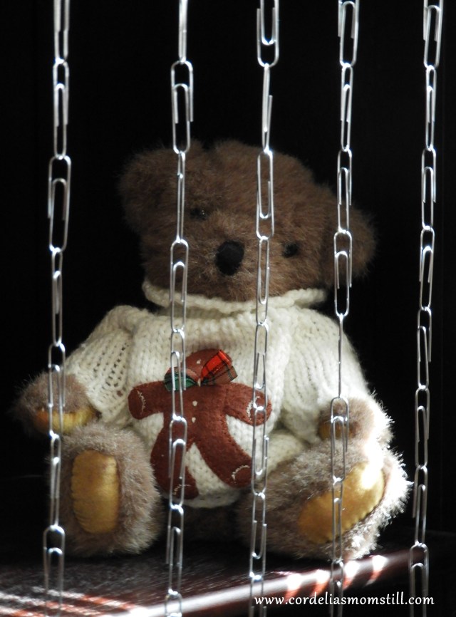 So much for today’s decorating and history lesson. I must go untangle those chains I put together for the photo shoot. Teddy Rosalie wasn’t thrilled to sit behind the “curtain” – but Puppy Cody refused to sit still at all.
