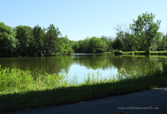 I thought sure she would jump at her first hearing of a bullfrog call – but she seemed more curious than scared.  There are lots of bullfrogs in that lake.  It sounded like one of them was right below where I was standing and I got as close to the water as possible, hoping to catch that award-winding photo.