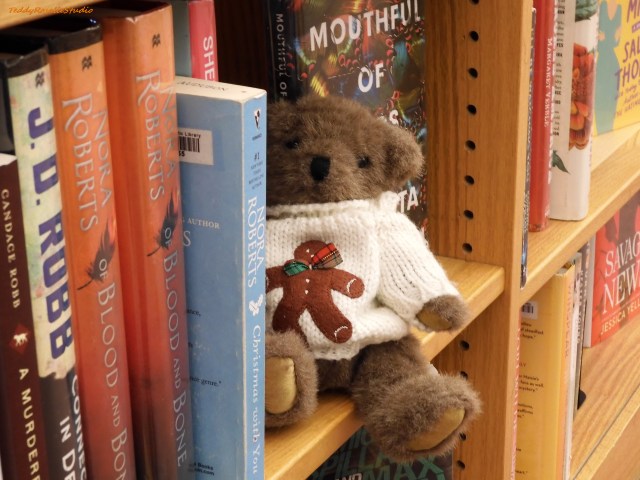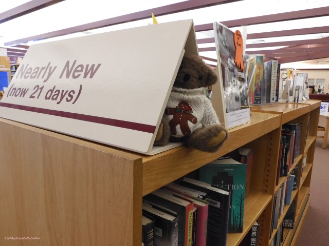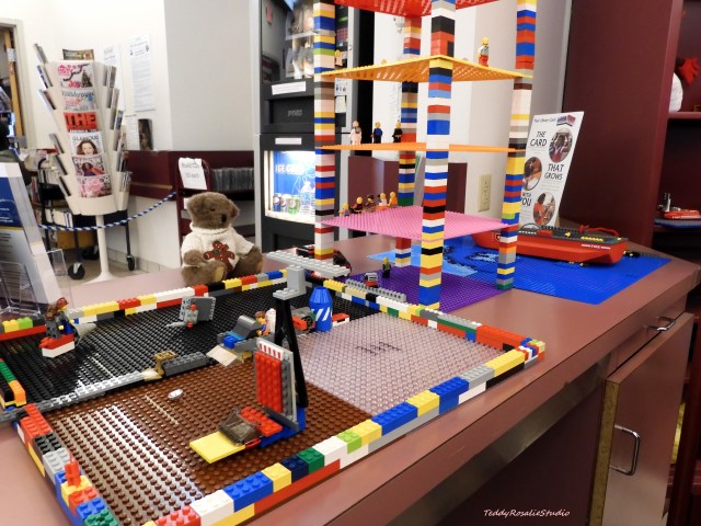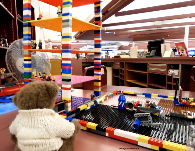 But just as I snapped the shot of Teddy in front of the LEGOs, a librarian approached from behind the desk. A rather tall, male librarian. I nearly peed myself, but I managed to mumble that Teddy Rosalie likes to go various places to do photo shoots and that today she had decided to visit the library. The librarian smiled and suggested that perhaps I would like to take the photo from his side of the desk so as to get Teddy’s face. Really? That’s allowed? Of course! So I did: